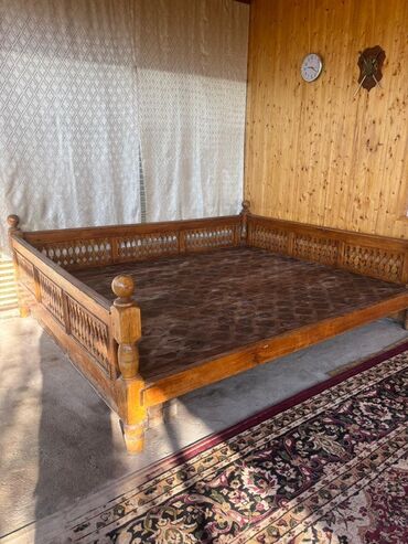 Резной деревянный топчан (айван) с центральным столиком - Материал: массив дерева (натуральная древесина), ручная резьба по всем бортам и ножкам, декоративные балясины по углам. - Конструкция: про...