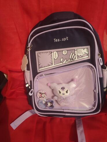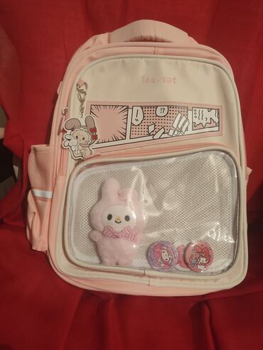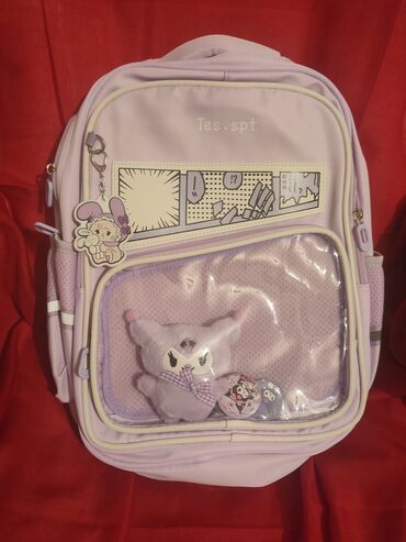 - Нежно‑розовый Tes.spt: прозрачный внешний карман‑витрина (ита‑зона) с сеткой, брелок‑кролик, два тематических значка.