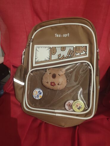 - Коричневый Tes.spt: прозрачный внешний карман‑витрина (ита‑зона) с сеткой, плюшевый медвежонок и два значка.
