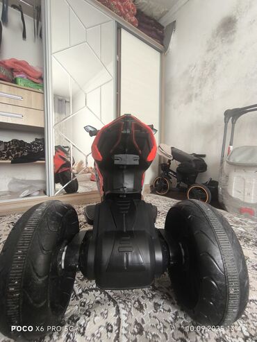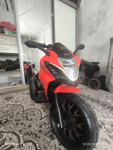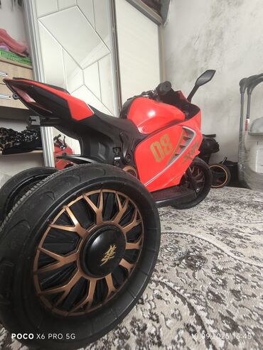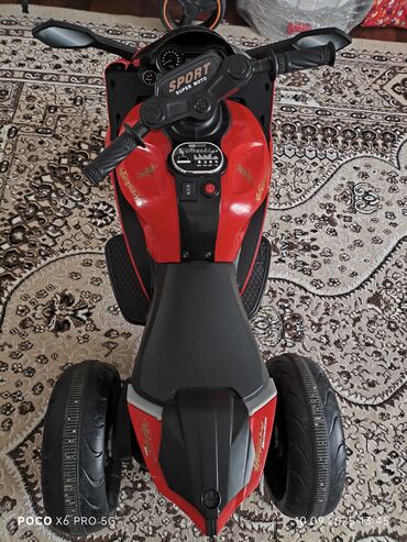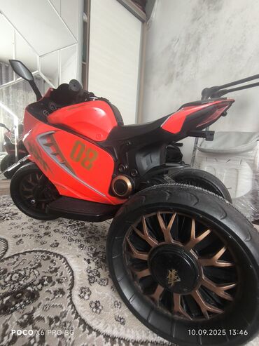 Состояние как новый Детский электромотоцикл-трицикл GS (стиль турэндуро), с дополнительными боковыми колесами для устойчивости. Характеристики и элементы: - Электропривод, кнопка включения на «ба...