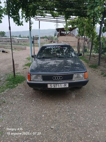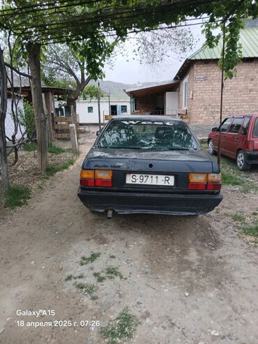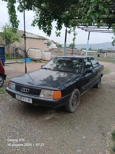 Audi 100 C3, седан, черный цвет. Атмосферный бензиновый двигатель, передний привод. Кузов классической формы с фирменной решеткой и эмблемой Audi, прямоугольные передние фары, задние фонари с раздельными секциями. Стекла тонированные, на лобовом – наклейка. Колесные диски стальные, штатные.