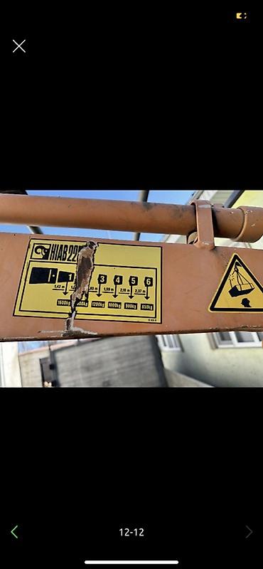 - Кран-манипулятор: HIAB 22 (табличка грузовых характеристик на стреле на фото). Грузовые моменты по секциям стрелы указаны на шильдике: до 1600 кг на минимальном вылете, далее последовательно 1400/1200/1000/900/850 кг на увеличенных вылетах.