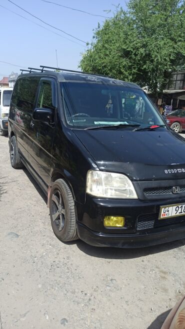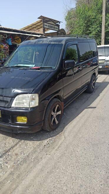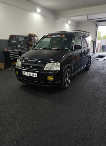Черный минивэн Honda Stepwgn с багажником на крыше. Автомобиль оснащен тонированными стеклами, литыми дисками и передними противотуманными фарами желтого цвета. На капоте присутствует дефлектор, а на заднем стекле – декоративная наклейка с изображением орла и логотип «STEPWGN». Ветровое стекло украшено черной полосой с надписью «adidas» по центру, а также солнцезащитной полосой.