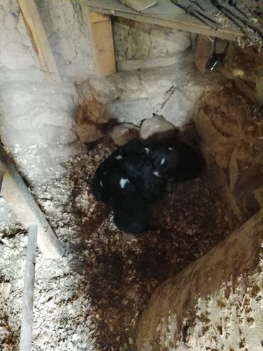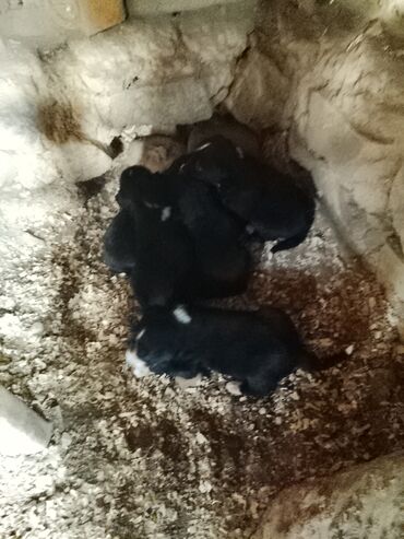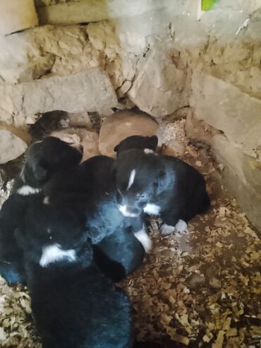 Щенки средних размеров, гладкошёрстные, чёрные с белыми отметинами. На фото помёт из нескольких малышей: у всех короткая густая шерсть, белые «носочки» на лапах, белая грудка и тонкая белая полоска на мордочке у некоторых щенков. Глаза уже открыты, активно ползают и играют между собой.