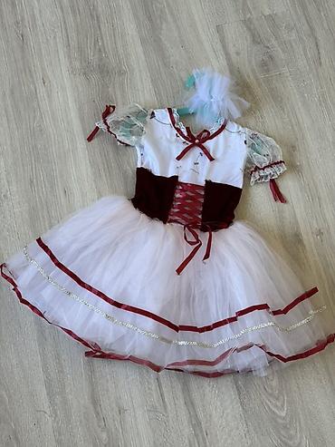 - Пышная белая фатиновая юбка с бордовыми и серебристыми лентами по подолу.