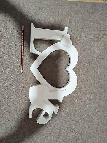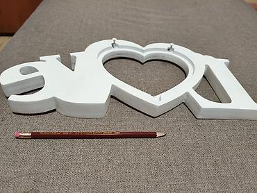 - Форма: объемные буквы LOVE, вместо буквы O — вырез в форме сердца.