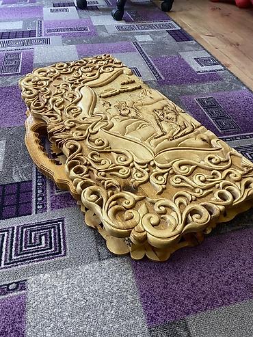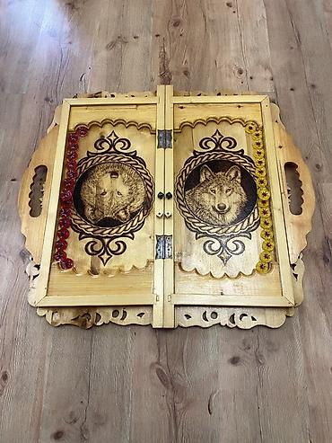 - Дизайн: рельефные орнаменты с обеих сторон крышки; внутри — пирография с изображением волка в медальоне, фигурные борта и прорезные элементы.