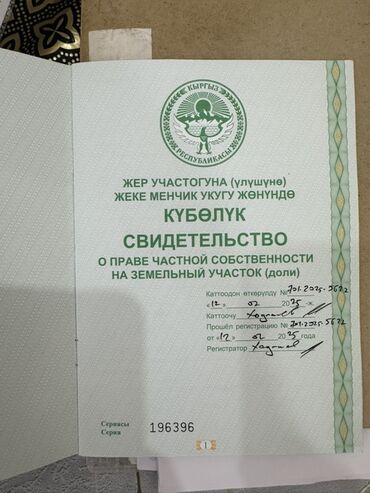 Наличный расчетБеш-кунгей! Только Вацап!Земельный участок с правом частной собственности (КР). На фото — свидетельство о праве частной собственности на земельный участок (доля) с регистрационными отметками 2025 года.