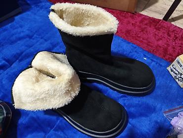 - Зимние сапоги/угги: черные, с высоким ворсом внутри (кремовый меховой подклад), утепленный высокий голенищный вал, толстая рифленая подошва с двойным кантом. Мягкие, теплая внутренняя отделка по всему объему, удобная посадка без шнуровки. Подходят для повседневной носки в холодную погоду.