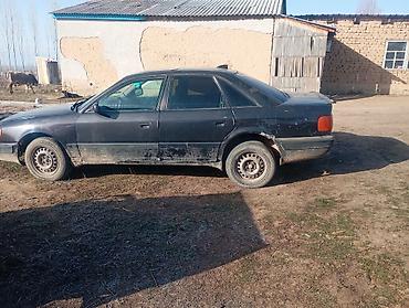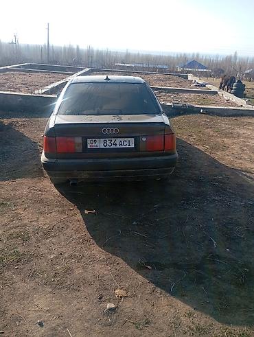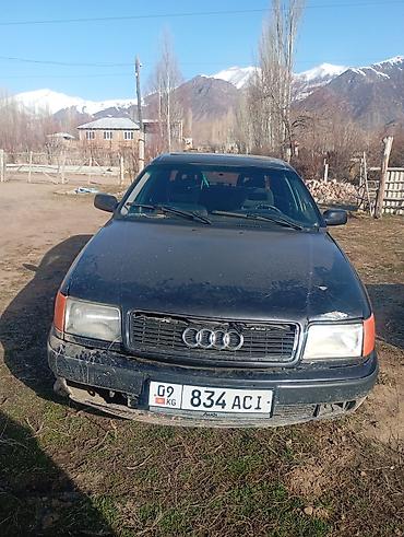 Audi 100 C4, седан, темно‑серый цвет. Кузов классической формы, 4 двери, тонированные стекла. Передний привод. Заводская оптика с прямоугольными фарами, фирменная решетка с четырьмя кольцами. Стальные штампованные диски, запас по клиренсу для проселочных дорог.