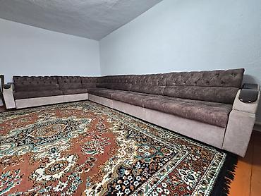 - Конфигурация: Г-образный длинный диван из секций, образует угол, рассчитан на большое количество посадочных мест.