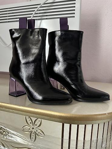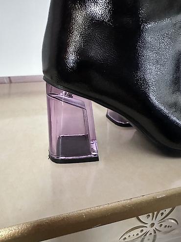 - Каблук: устойчивый геометрический, прозрачный лиловый акрил/пластик, высота средняя (около 6–7 см), визуально облегчает силуэт и добавляет футуристичный акцент.