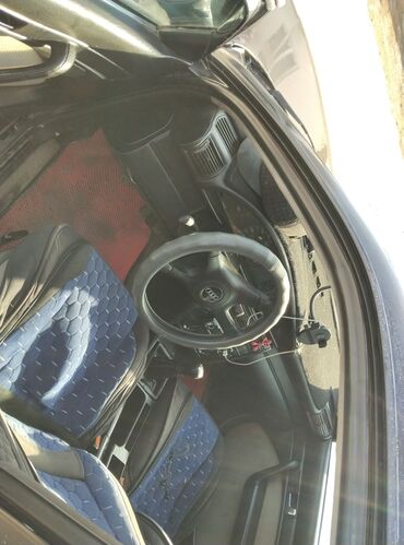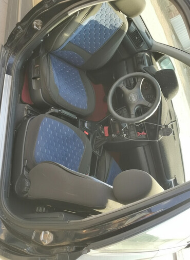 - Интерьер: тканево-кожаные чехлы синего цвета с сотами, трехспицевый руль с логотипом Audi.