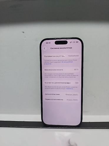 - На скриншоте раздел «Состояние аккумулятора»: максимальная емкость 96%, количество циклов перезарядки 289, состояние «Нормальное». Указаны даты: изготовление — февраль 2025, первое использование — апрель 2025.