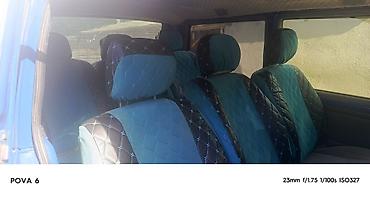 Mercedes-Benz Vito (W638) — синий микроавтобус/фургон. Основные особенности: - Кузов: длинная база, сдвижная боковая дверь, рейлинги на крыше. - Салон: сиденья с тканевой обивкой, ремни безопаснос...