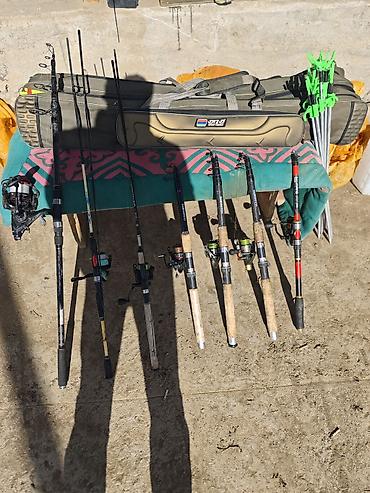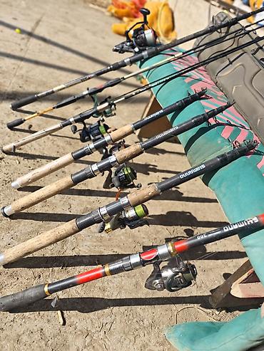 - 7 спиннингов/удилищ разной длины и строя, часть телескопические. На нескольких установлены безынерционные катушки.