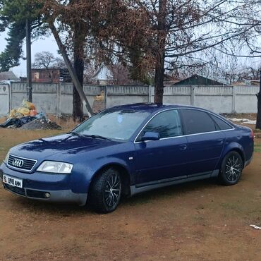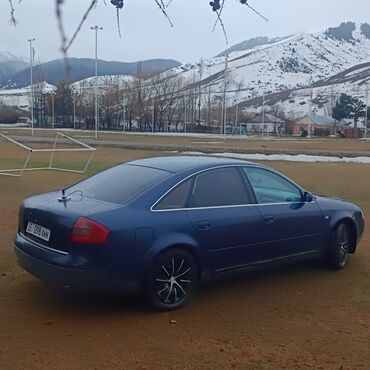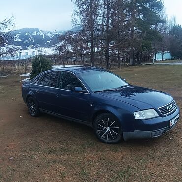 Audi A6 седан, темно‑си/рестайлинг переходный, оригинальная решётка Audi, тонированные стёкла. Колёсные диски легкосплавные, черные с контрастной шлифовкой, зимняя резина на фото. Передние фары линзовые, задние фонари затемнённые. Бамперы и пороги с защитным серым обвесом. Антенна на крыше, хром‑окантовка по линии остекления. Просторный салон на 5 мест, 4 двери, большой багажник — классический бизнес‑седан с комфортной посадкой и хорошей шумоизоляцией. Привод и мотор не указаны; тип топлива и коробка передач не отмечены. Номерные знаки KG 01 региона на автомобиле.