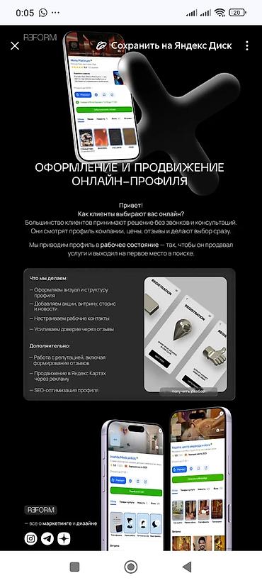 Цель услуги — привести профиль в рабочее состояние, чтобы он продавал услуги и выходил на первые места в поиске. Reform — все о маркетинге и дизайне.