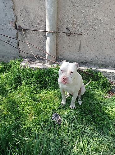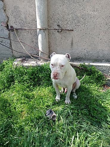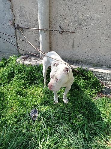 Американский питбультерьер, кобель, белый окрас. Крепкое, мускулистое телосложение, купированные уши, мощная голова и выраженная грудь. Короткая гладкая шерсть, удобна в уходе. Активный, внимательный, хорошо реагирует на дрессировку. Подходит для опытного владельца, заинтересованного в спорте с собакой, охране частной территории и качестве компаньона при условии регулярных тренировок и социализации.