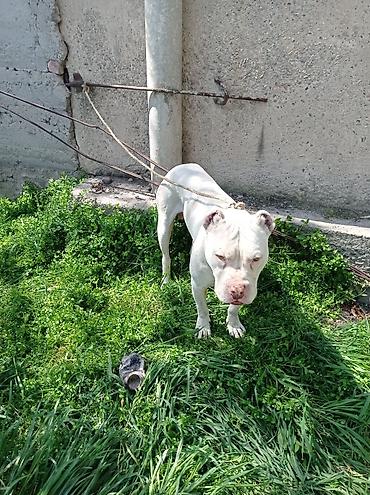 Собака крупной породы, кобель, полностью белого окраса. Крепкий костяк, мускулистое телосложение, широкая грудь. Голова массивная, уши купированы, темные губы и нос. Глаза светлые. На шее прочный с...