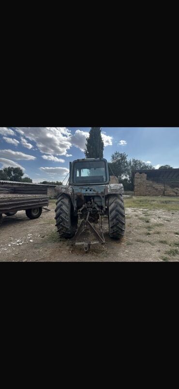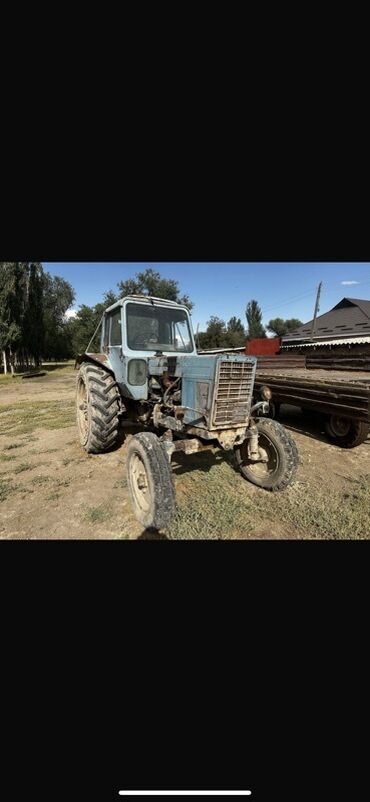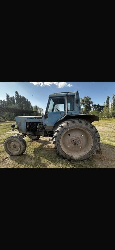Трактор колёсный, класс тяги ориентировочно 1,4–2,0 (тип МТЗ/ЮМЗ). Кабина остеклённая, с дверями и люком. Колёсная формула передние колёса сдвоенные узкие, задние — крупные с грунтозацепами. Двигатель дизельный рядный, доступ к узлам открытый; механическая коробка передач. Передняя светотехника: фары и габариты, задняя часть оснащена навеской и прицепным устройством трёхточечной системы, гидрораспределитель, тягово-сцепное устройство, гидравлические шланги выведены назад. Имеются крылья задних колёс, стеклоочиститель лобового стекла, боковые зеркала. Радиаторная решётка металлическая, передний бампер с проушинами. Подходит для пахоты, культивации, посева, транспортных работ с прицепом и агрегатирования с навесным оборудованием (плуг, борона, косилка и др.). Цвет — сине-голубой. Отличный базовый трактор для сельхозработ и коммунальных задач.