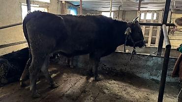 Бык (молодняк мясного направления), черной масти с белыми отметинами. Рога короткие, уши с бирками. Содержится на привязи в крытом стойле, кормление сеном и силосом из кормушки, доступ к воде. Тело...