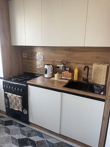 - Газовая плита с духовкой, рабочая поверхность с розетками, электрочайник.
