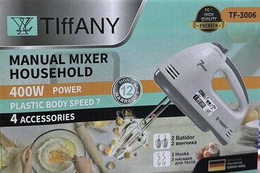 - Комплектация: 2 венчика + 2 крюка для теста (всего 4 насадки)