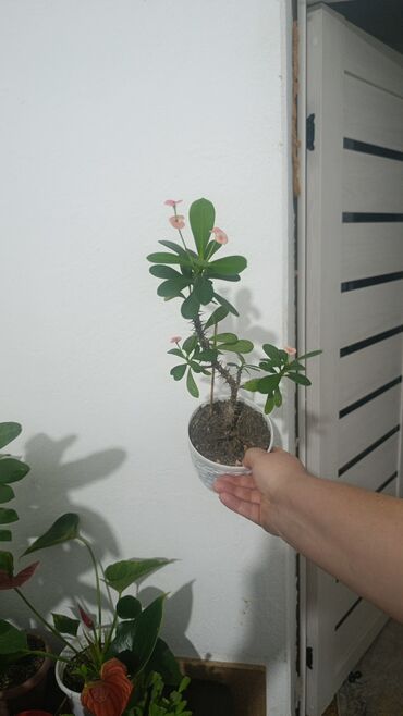 - Суккулент с колючими побегами и нежными розовыми прицветниками.