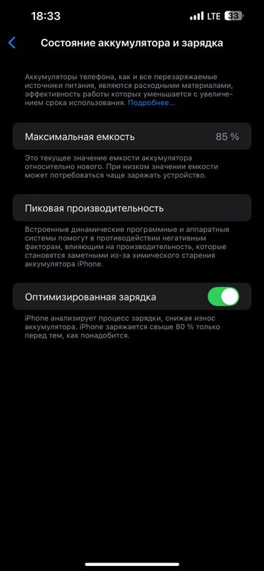 - Аккумулятор: максимальная ёмкость в настройках «Состояние аккумулятора» — 85% (см. скрин).