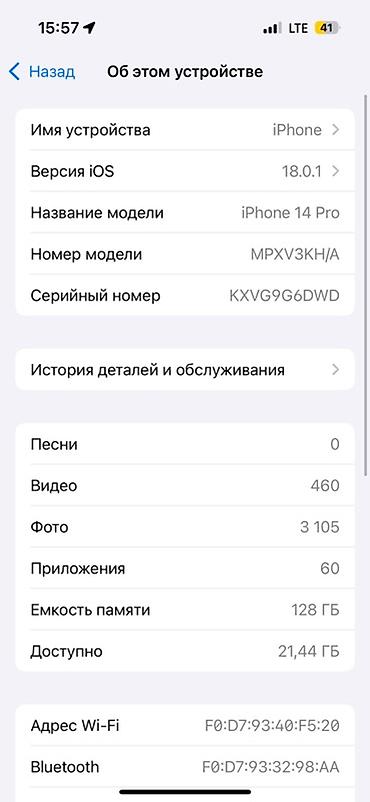 IPhone 14 Pro, модель MPXV3KH/A, цвет Space Black. Память 128 ГБ (доступно около 21,44 ГБ). Установлена iOS 18.0.1.