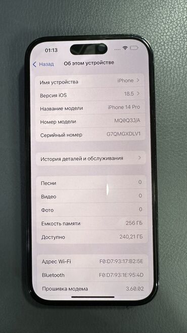 IPhone 14 Pro 256 ГБ, цвет Silver (серебристый) Характеристики и особенности: - Модель: iPhone 14 Pro (номер модели MQ103KH/A) - Память: 256 ГБ (доступно ~241,21 ГБ на фото) - iOS: версия 18.0 - Д...