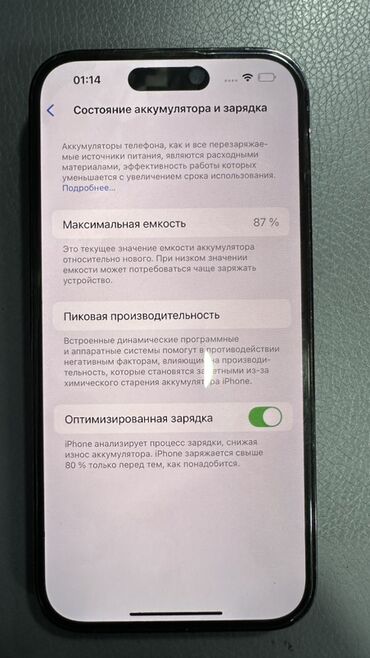 - Аккумулятор: максимальная ёмкость 87%, включена «Оптимизированная зарядка».