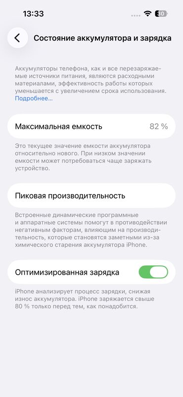 - Аккумулятор: максимальная ёмкость 84% (скриншот в галерее), включена «Оптимизированная зарядка».