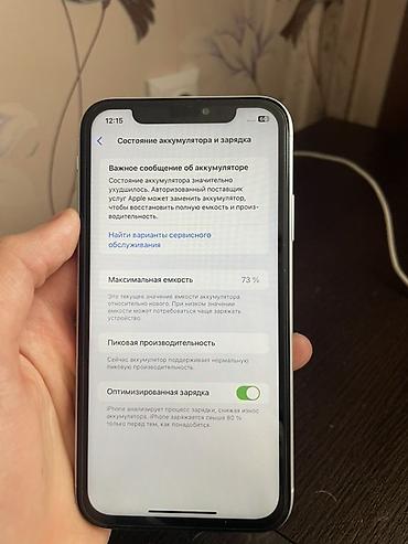 - Состояние аккумулятора по iOS: максимальная емкость 73% (на экране есть уведомление о необходимости обслуживания).