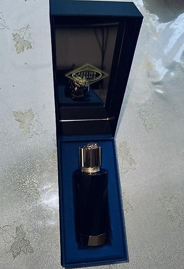 Флакон: тяжелое темное стекло с металлическими элементами; коллекционная коробка с зеркальной внутренней крышкой и синей вкладкой.