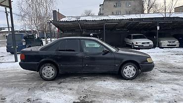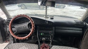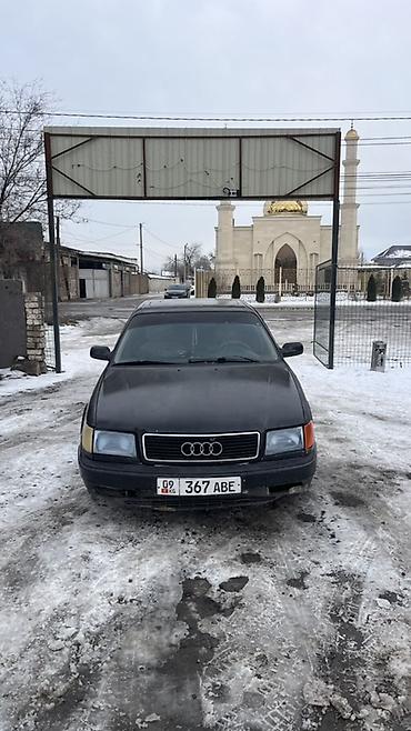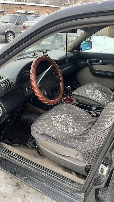 Audi 100 C4, седан, черный цвет. Механическая коробка передач. Передний привод. Интерьер тканевый, чехлы на сиденьях (передние и задние), на руле оплётка. Центральная консоль с магнитолой/радио и USB, климат-блок с регулировкой обдува/печки, прикуриватель/розетка 12V. Электростеклоподъёмники спереди, наружные зеркала с механической регулировкой. Задний ряд просторный, коврики резиновые, багажное отделение доступно из салона. Фары прямоугольные, фирменная решётка радиатора Audi, литая эмблема на руле и носу. Номерные знаки KG видны на фото.