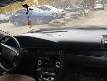 Салон черный: классическая панель приборов Audi, трехспицевый руль с логотипом, центральная консоль с магнитолой/радио, блоком управления печкой и дефлекторами, механическая коробка передач, тканевые сиденья с чехлами.