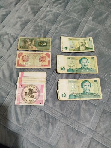 Коллекция " Деньги - купюры": 1. 1 сом - КР; 2. 100 польских злотых.1988 г. 3. 1 юань Китай; 4. 1000 испанских пессет.1992 г. 5. 10 рублей ссср. 1961 г. 6. 500 туркменских манат. 1995 г. 7...4 000 KGS