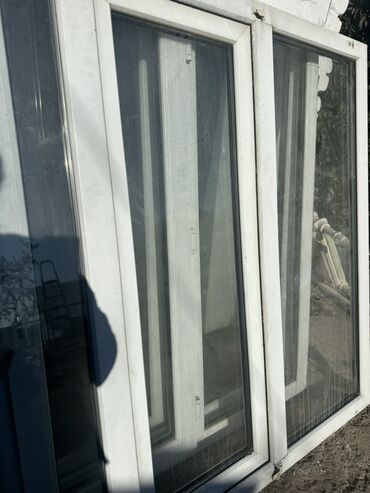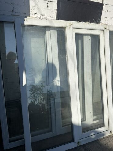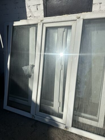 Комплектность по фото: створки, рамы, стеклопакеты, фурнитура на створках и нижних каретках. Размеры визуально крупные; уточняйте замер по месту.