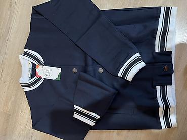 Детский бомбер/куртка в стиле varsity. - Цвет: темно‑синий корпус, молочные рукава; контрастные белые полоски на воротнике, манжетах и поясе. - Застежка: кнопки по всей длине. - Внутри мягкий флис...