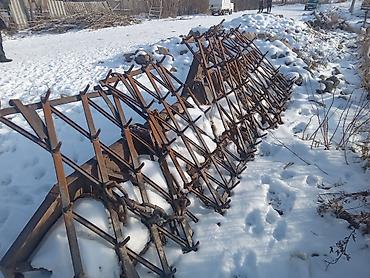 - Металлическая рама, зубья из прутка, секции складываются для транспортировки/хранения.