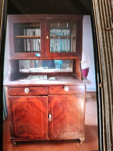 Винтажный кухонный буфет/сервант из массива/шпон, классический дизайн середины XX века. - Конфигурация: верхняя часть с застеклённой витриной (раздвижные стеклянные дверцы), внутри полка; справа —...