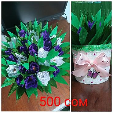 Букеты из гофрированной бумаги с конфетами внутри. - Состав: ручные цветы из гофробумаги, в каждом бутоне — сладкая начинка (конфеты). Пышная зелень, аккуратная упаковка. Возможен вариант в декора...