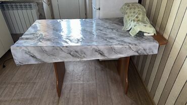 Кухонный обеденный гарнитур “Мрамор” Состав: - Стол прямоугольный на центральной опоре - 4 табурета с мягкими сиденьями Дизайн и материалы: - ЛДСП с рисунком под белый мрамор, кромка ПВХ - Стабил...