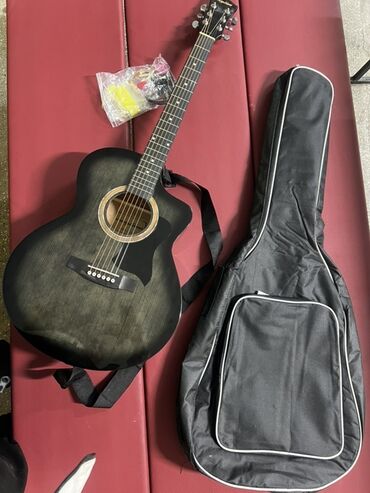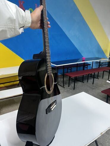 Акустическая гитара черного цвета (формат типа Auditorium/фолк, с вырезом cutaway). Корпус глянцевый, розетка с декоративной инкрустацией. 6 металлических струн, классический анкерный гриф с ладовыми метками. Верхняя дека с нанесением под «чёрный сатин», нижняя часть корпуса — глубокий глянец.
