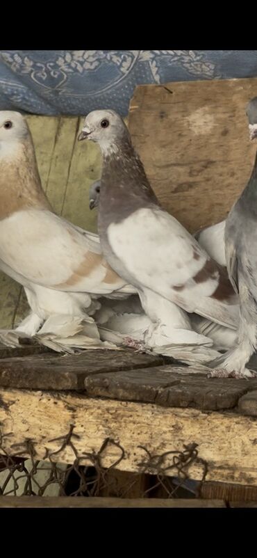 Породистые голуби, декоративные «космачи» (длинные махровые перья на лапах). Разные окрасы: сизый с металлическим отливом шеи, бело-пегие, рыже-пегие, серо-поясные. Компактное телосложение, округлая голова, короткий клюв, хорошо развитое оперение крыльев и хвоста.