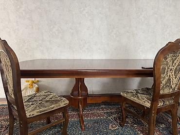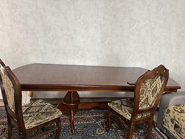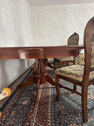 Классический обеденный стол со стульями х6 из массива дерева с резным центральным основанием и двумя опорными «лапами». Длина 2,5 метров ширина 1,10