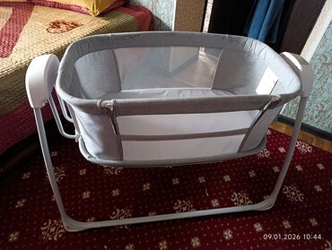 Размеры ориентировочно по фото: длина спального места около 80–90 см, ширина 40–50 см. Цвет универсальный серый, нейтрально смотрится в интерьере. Подходит для сна и дневного отдыха малыша с хорошей циркуляцией воздуха и визуальным контролем.