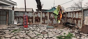 - Участок огорожен металлическим забором-профлистом. Просторный двор: есть мощёная камнем площадка, зона для сушки белья, отдельные хозпостройки/сараи, навесы для инвентаря и дров.